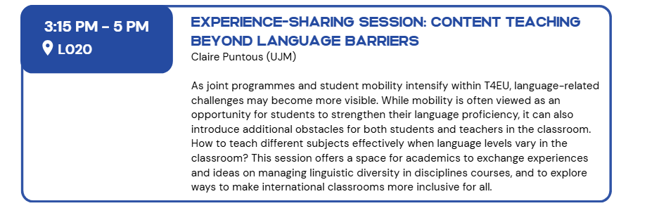 During the workshop entitled “Experience-sharing session: Content teaching beyond Language Barriers”, around twenty teachers from T4EU partner universities discussed the obstacles to increasing the quality and the number of teachers in English-taught programmes for the institutions concerned. More specifically, the discussions focused on the role of tailored programmes and solutions to increase the number of teachers who use English primarily, as well as other languages, in their courses.